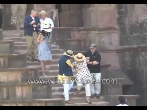 Clinton Stairs }}- The former presidential candidate of USA, Hillary Clinton visits India for a forum. She slips on the stairs as she visits the ancient fort of Jahaz Mahal in central ...